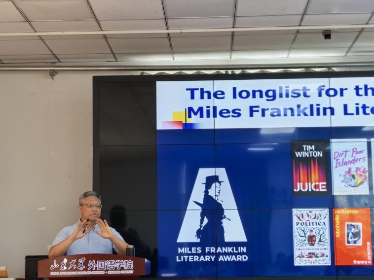 2025年5月27日,武汉大学澳大利亚研究中心主任、外国语言文学学院副教授黄忠应邀出席山东大学外国语学院“文渊论坛”,以“澳大利亚华裔文学中的华人男性气质”为题作学术报告。本次讲座由外国语学院党委书记刘华及刘鲁蓉老师共同主持,英语系李保杰教授等参与学术研讨,并吸引众多师生到场聆听。