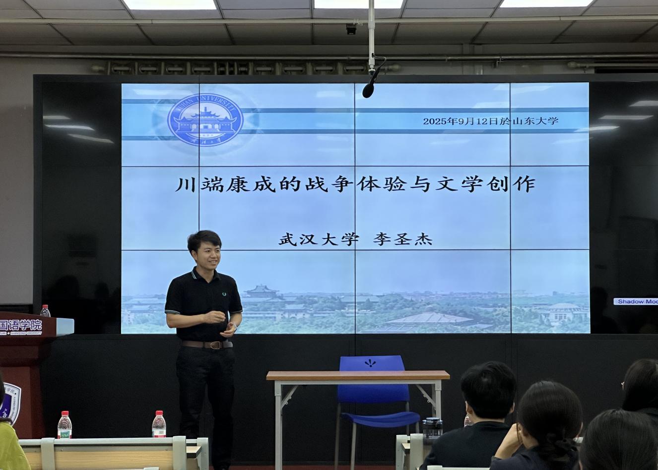 9月12日晚,武汉大学外国语言文学学院院长、博士生导师李圣杰教授应邀出席山东大学外国语学院2025年第7期“环球论坛”,作题为“川端康成的战争体验与文学创作”的学术报告。本次讲座由外国语学院日语系主任邢永凤教授主持。