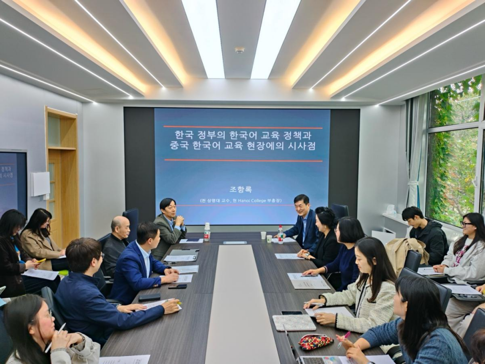 10月16日下午,韩国著名学者祥明大学赵恒録教授做客外国语学院“环球论坛”2025年第八期,作题为“韩国政府的韩语教育政策以及对中国韩语教学的启示”的学术报告。本次讲座由中日韩合作研究中心主任、韩语系牛林杰教授主持,韩语系系主任刘畅教授及韩语系师生参加了本次活动。