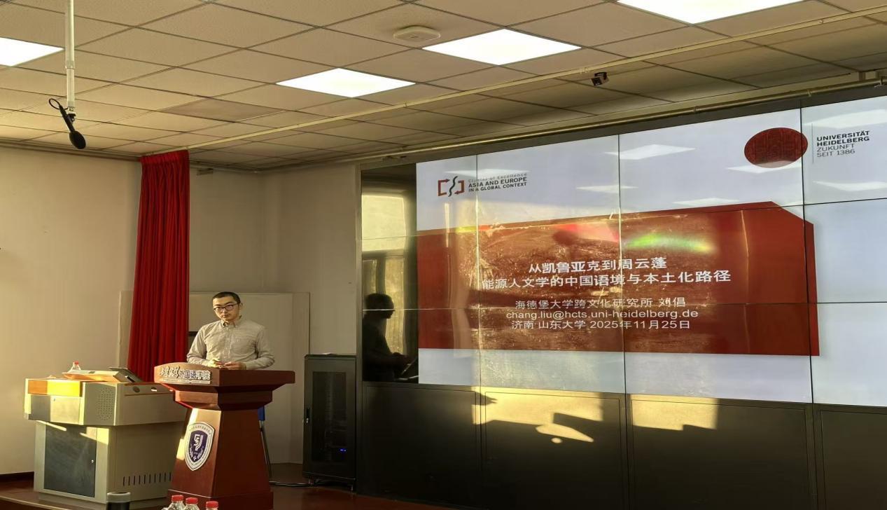 11月25日下午,山东大学外国语学院“博约论坛”2025年第2期学术讲座在洪家楼校区举行。本期论坛特邀德国海德堡大学跨文化研究所研究员刘倡博士担任主讲,以“从凯鲁亚克到周云蓬:能源人文学的中国语境与本土化路径”为题,为外院师生带来一场跨越文学、音乐、生态与能源领域的跨学科思想盛宴。讲座由山东大学外国语学院郑春光副研究员主持,