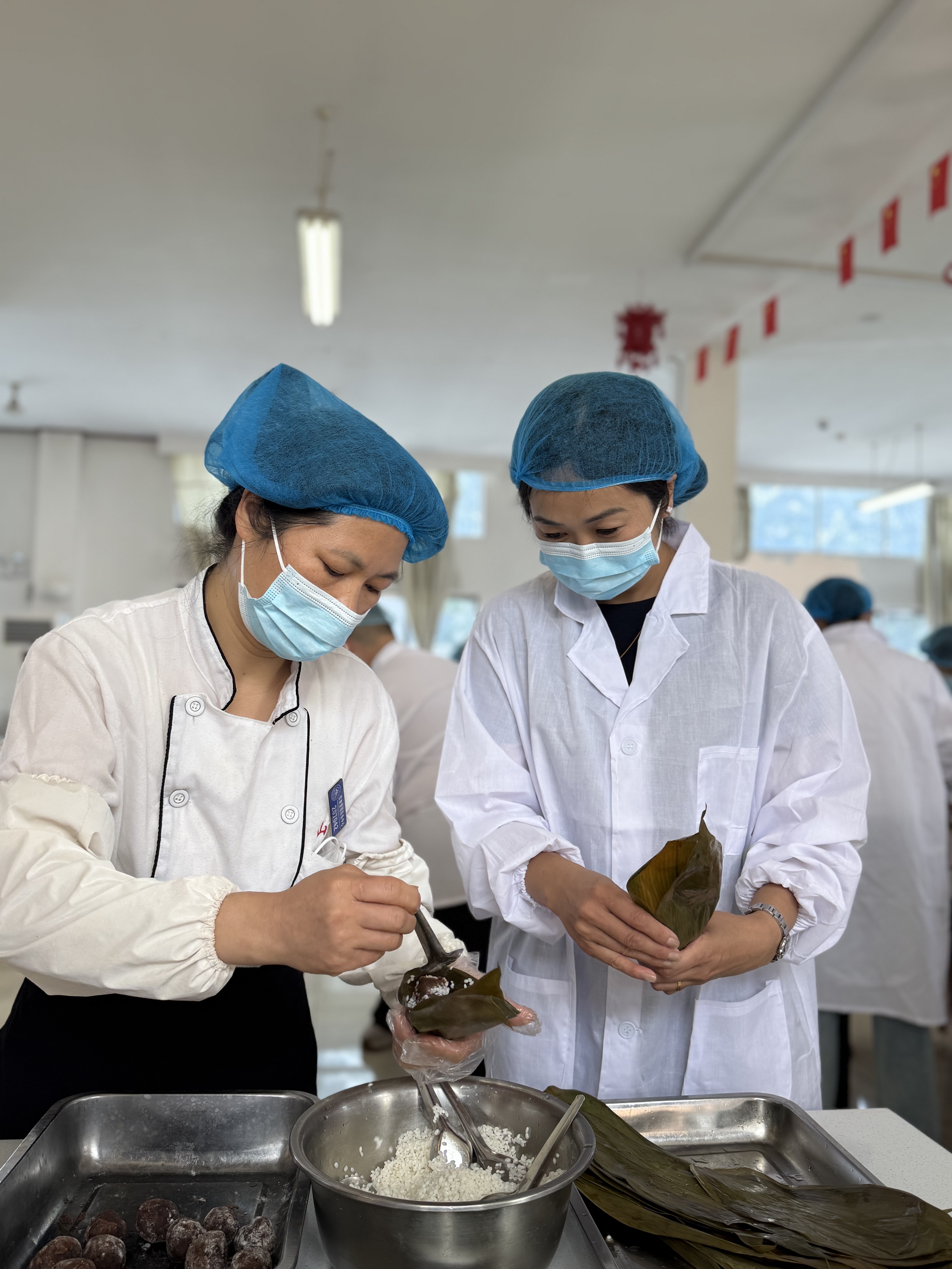 青箬叶、白糯米、赤豆沙、金蛋黄在桌案上整齐铺开,经验丰富的食堂师傅率先示范,巧手翻飞间,粽叶卷成漏斗,糯米馅料填入压实,丝线缠绕捆扎,棱角分明的粽子一气呵成。大家也跃跃欲试,纷纷化身“端午匠人”:有人专注研究折叶技巧,力求棱角分明;有人创新捆扎方式,横缠竖绕碰撞出别样形状;更有人自发结成“互助小组”,老手带新手,细绳缠绕的不仅是粽子,更是同事情谊。现场笑语盈盈,粽香与欢声交织升腾。