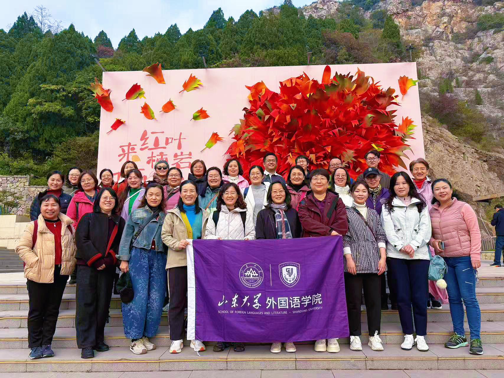 为丰富教职工文化生活,放松身心,增进交流,2025年10月26日,山东大学外国语学院工会精心组织学院教职工前往素有“齐鲁第一川”之美誉的红叶柿岩旅游区,开展了一场别开生面的金秋赏叶活动。外国语学院党委副书记、工会主席马蕾带队,三十余名教职工参加秋游。