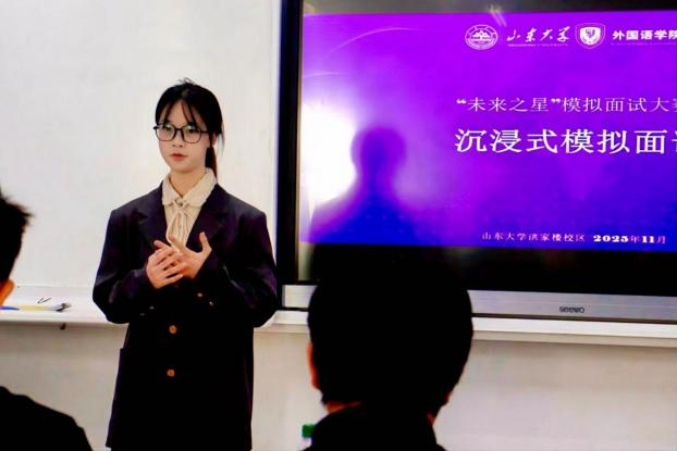 为助力学生科学规划职业生涯、提升就业竞争力,赋能学生全面成长,11月9日,外国语学院举行“未来之星”模拟面试大赛决赛。本次比赛特邀学而思济南分校招聘主管王梦睿、学而思培优事业部济南分校招聘主管郭子松、学而思职业规划师张莹雪及2022级英语专业本科生薛俊鸿担任评委。