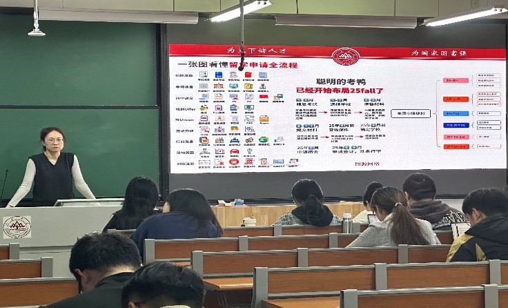 在内容讲解环节,朱蕾结合详实资料与教学经验,分别从考研、保研与境外升学三个方面进行深入解读。考研部分重点介绍了关键时间节点、信息获取渠道与备考资源;保研部分详细讲解了综合评价成绩的构成,并在竞赛、科研、英语能力等方面提出提升建议;境外升学部分则涵盖院校选择、材料准备、语言考试与奖学金申请等内容,并提醒同学们理性看待中介服务,主动把握申请过程。