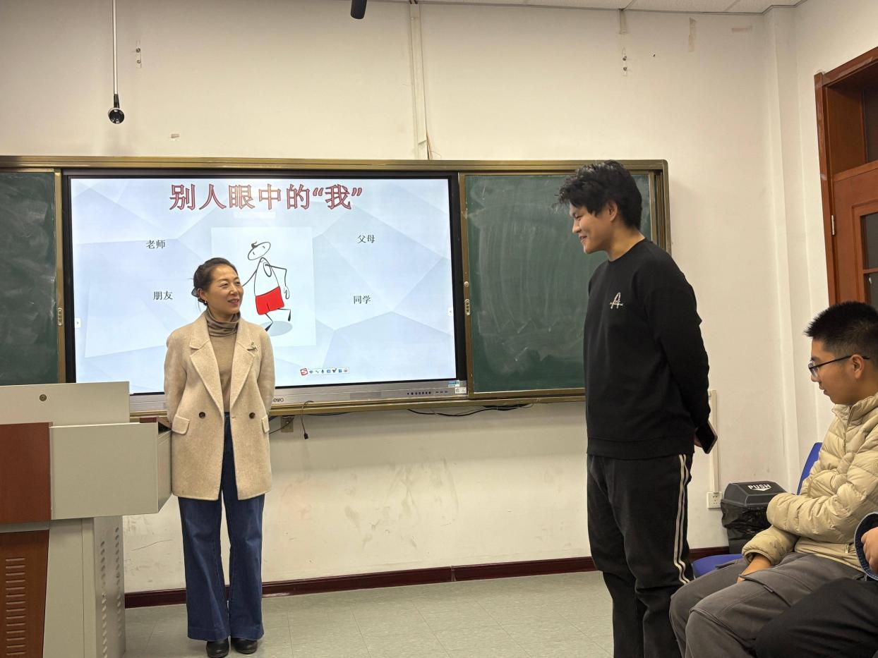 在“别人眼中的我”分享环节,赵婧婧首先分享了个人成长故事,讲述了如何将“向内指责”的思维惯性转化为成长力量。在她的鼓励下,同学们纷纷敞开心扉,坦诚交流自身在社会比较中的困惑、在他人评价中的摇摆与迷茫。通过分享互动,同学们认识到,外界评价可作为自我提升的参考,但不应成为心灵的枷锁,真正的自我价值感源于内在的建构与确认,而非对外部反馈的过度依赖。