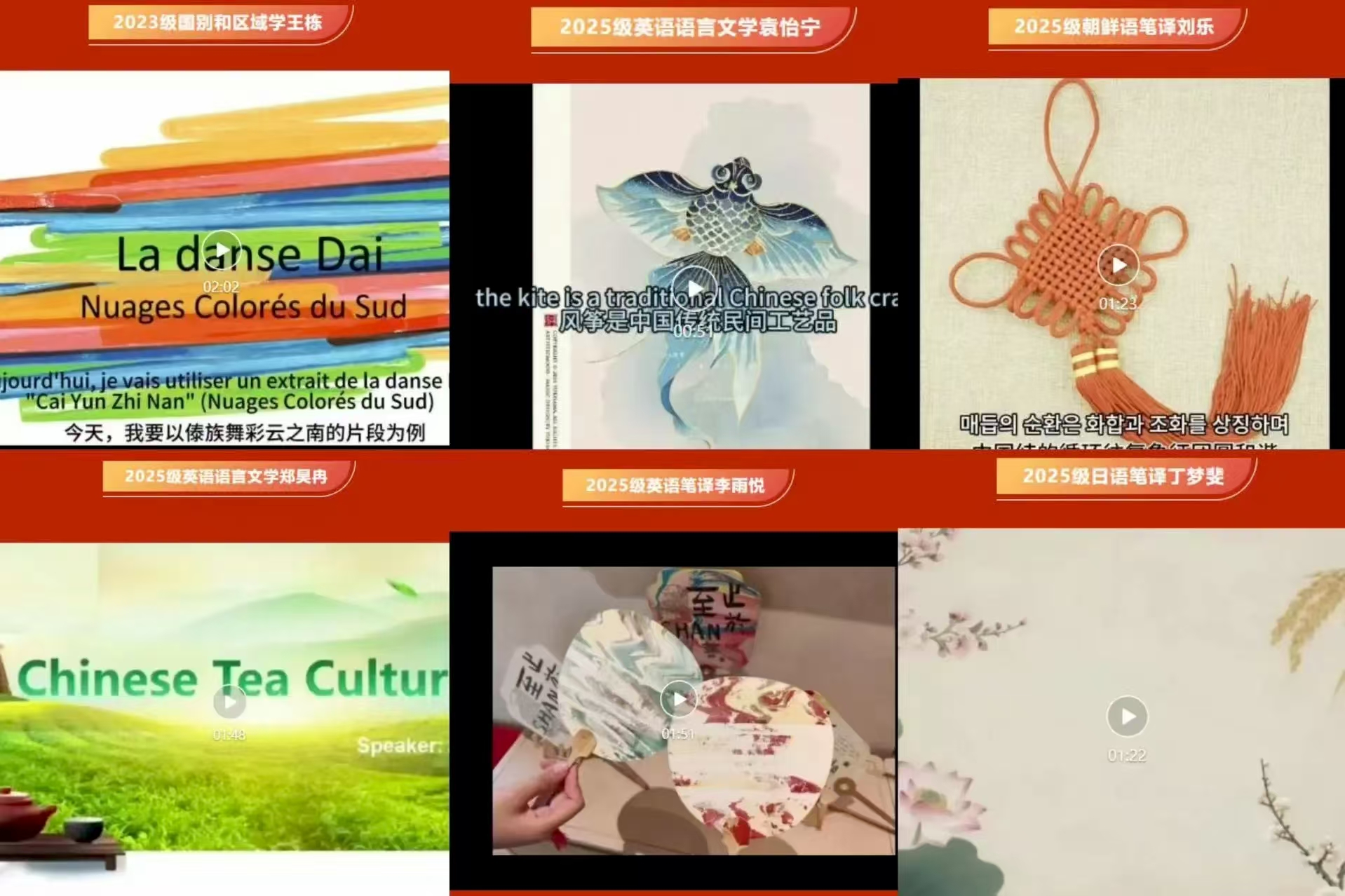“多语思政”系列活动第三期——“传统文化我来讲”视频分享活动中,外院学子积极用外语介绍中华优秀传统文化,提交的视频作品涵盖文学艺术、传统节日、民间工艺等多个领域,以双语字幕精彩呈现,展示了中华传统文化的魅力。