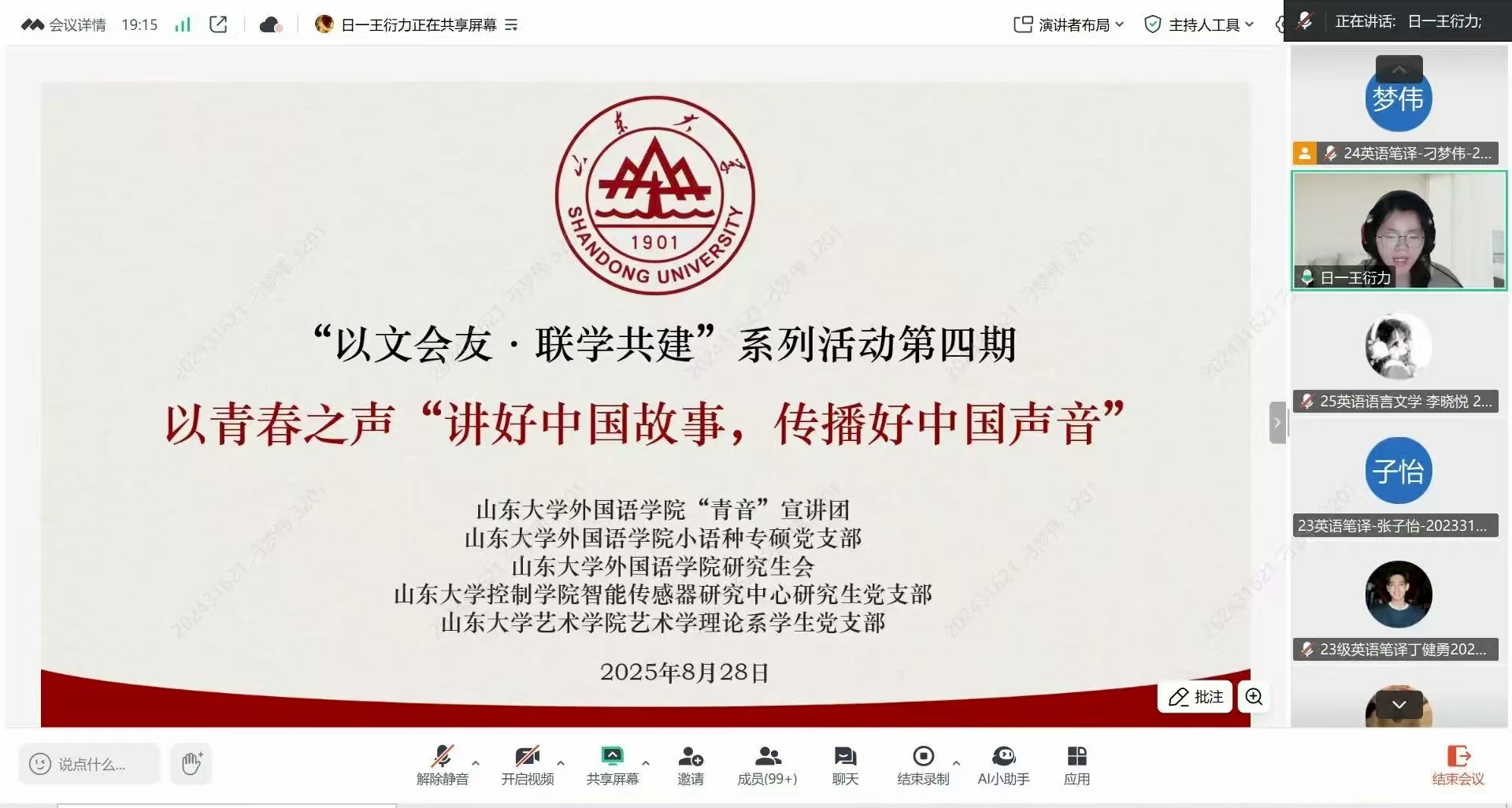 “以文会友・联学共建”系列活动旨在通过跨学科的主题宣讲,通过政策解读、案例分享、互动交流等形式,促进不同学科背景学生之间的学习交流与实践探讨。活动期间,外国语学院“青音”宣讲团、外国语学院小语种专硕党支部、外国语学院研究生会,联合控制学院智能传感器研究中心研究生党支部、艺术学院艺术学理论系学生党支部,举办了“以文会友・联学共建”系列活动第三期和第四期,吸引了来自外国语学院、艺术学院、控制学院的众多师生参与。