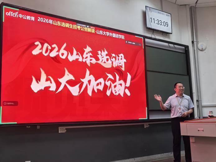 10月11日上午,山东大学外国语学院成功举办公职类考试公告解读导学精品讲堂。本场讲座由外国语学院研究生会实践部组织,特邀中公教育资深宣讲师郝广义主讲,外国语学院研究生辅导员张新苑、中公教育高新区负责人李健参加本次讲座,80余名外国语学院研究生积极参与。