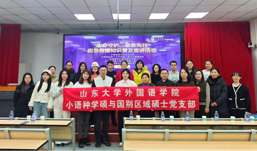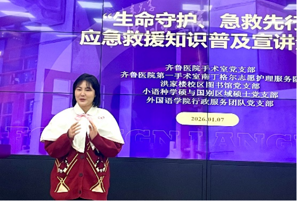 岁暮天寒,安全相伴。为增强师生安全意识与应急救护能力,1月7日下午,“生命守护,急救先行”应急救援知识普及宣讲活动在外国语学院7号楼301教室顺利举行。本次活动由外国语学院小语种学硕与国别区域硕士党支部、洪家楼校区图书馆党支部携手组织,联合齐鲁医院第一手术室南丁格尔志愿服务队、外国语学院行政服务团队党支部共同举办,活动旨在以专业急救知识普及为抓手,将生命教育融入基层党建实践。齐鲁医院第一手术室护士长房馨、主管护师赵博文、护士李悦担任主讲嘉宾;外国语学院行政服务团队党支部董然、外国语学院研究生辅导员张新苑与张竞丹、洪家楼校区图书馆党支部多名教师代表受邀出席本次活动。
