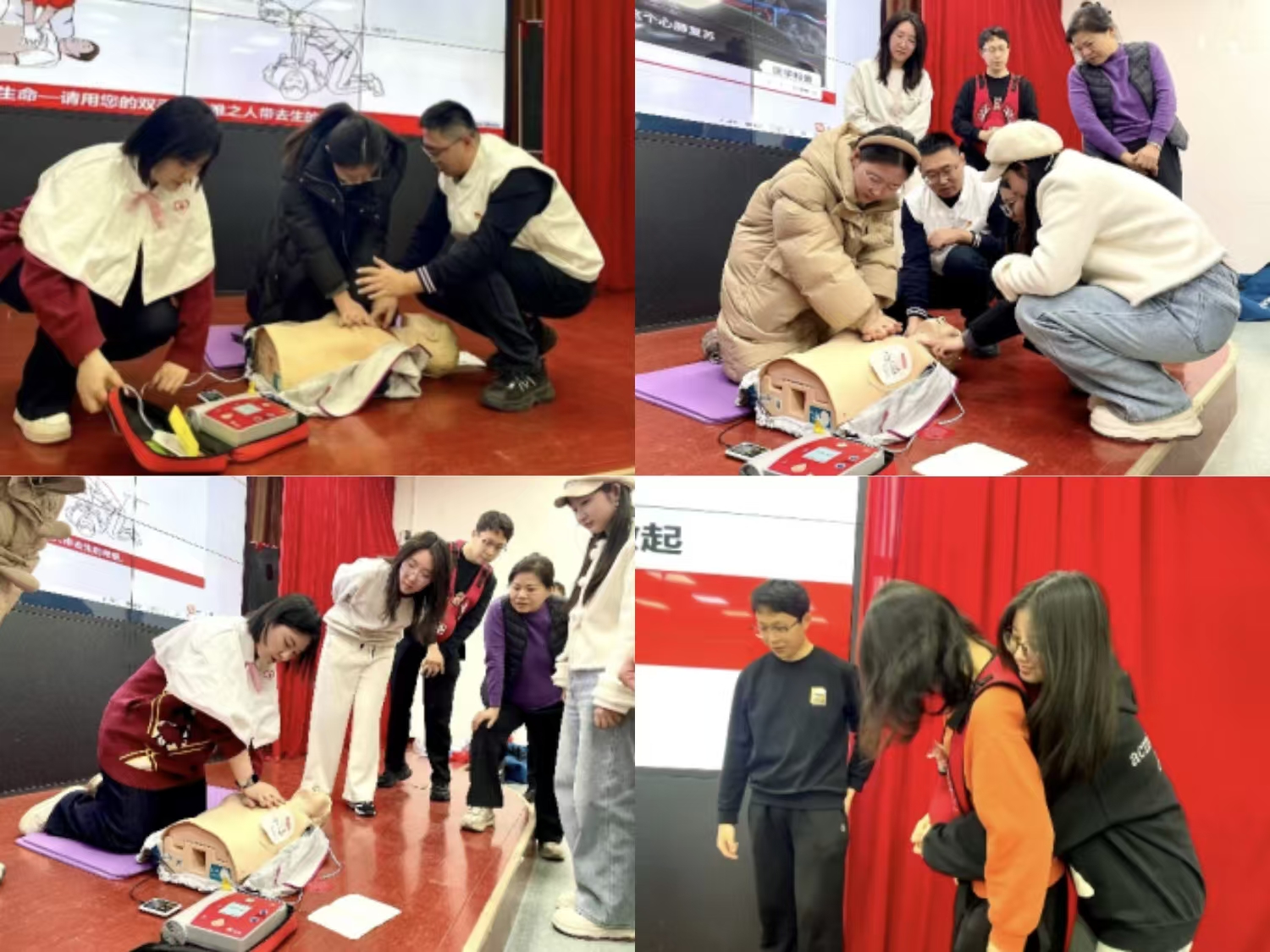 为进一步巩固学习效果,活动还设置了互动体验环节。多名师生主动上台参与模拟操作,在医护团队的耐心指导下进行实操练习,并就实际生活中可能遇到的急救问题进行现场提问。通过“手把手”教学与即时反馈,师生们切实将急救知识内化为可操作的能力。