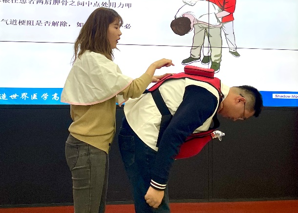 在讲解过程中,李悦还重点介绍了气道异物梗阻这一突发状况的应急措施。他结合典型案例,详细讲解了气道异物梗阻的识别要点,并现场演示了海姆立克急救法的操作步骤,强调在关键时刻迅速、规范施救的重要性,进一步提升了大家在突发紧急情况下的自救互救能力。