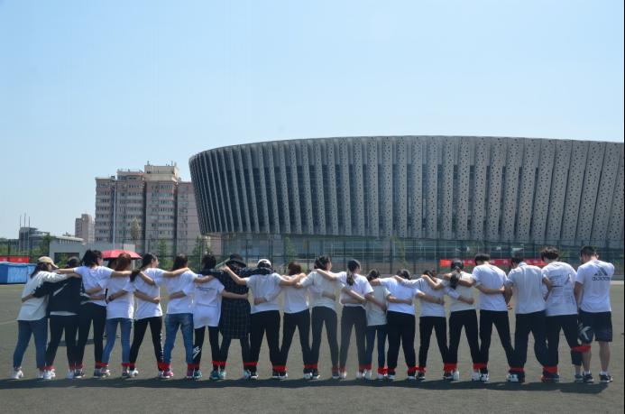 因为缺乏专业道具,参赛队员在训练上有较大难度,但同学们积极克服困难,发挥聪明才智,找来“红领巾”“呼啦圈”等物品自制赛事道具用于训练。“赛龙舟”项目中,因为道具的特殊性,队员们没有进行过模拟训练,赛中步伐大小不一致,让原本桀骜不羁的龙舟化身为一只可爱的毛毛虫,赛场上弥漫着轻松愉快的欢笑声。“传递正能量”项目中,队员们有了一周的“呼啦圈”练习基础,在极短的时间内迅速结束了比赛。“团结就是力量”项目的道具球体积之大让人望而生畏,而前几组中频发的摔倒意外更让人心惊,参赛队员商议过后,决定用男女对角线的站位完成比赛,男生主动承担起了道具球的大部分重量。“俄罗斯方块”对于团队默契和记忆能力都有较高要求,外国语学院作为第一组参赛队伍,在哨声响起之时,四名参赛队员如同离弦之箭一般弹了出去,最初有一些慌乱,但以极快的速度调整了过来,圆满完成了拼图。“二十人二十一足”是此次公认的难度最大、危险系数最高的项目,在此前的练习中也出现过摔倒、绑腿绳子脱开等插曲,哨声响起后,队员们齐心协力,口中喊着整齐响亮的口号,快速通过了终点线。夏日骄阳似火,队员们腿上沾满了塑胶颗粒、草屑,脸上豆大的汗珠晶莹剔透,但大家毫无怨言,用态度和行动彰显了外院风采。