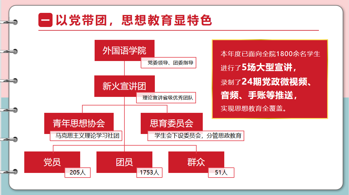 创新共青团工作方式,打造外院特色品牌。外院团委积极探索党建带团建的运行模式,从“党史、校史、院史”三个维度,组织“家乡党史我来讲”“双语思政”“外院历史小故事”等外院特色活动。颁布“青年大学习”实施办法,制定了“三查三促机制”,创新“学习+实践”的模式,在确保完成率的同时,实现学习成果的有效输出。创新性打造“感悟文化之美”“领略艺术之美”“守护心灵之美”“收获劳动之美”“彰显体育之美”美育工作五大板块,提高学生的美育体育素养。服务大局彰显担当,致力于培养兼具专业知识和全球胜任力的新文科外语人才,创新、丰富第二课堂活动形式,开放学习平台,整合内外资源,举办近30场系列讲座,多名学生参与国际组织相关活动并斩获多项国家级、省级等比赛表彰。