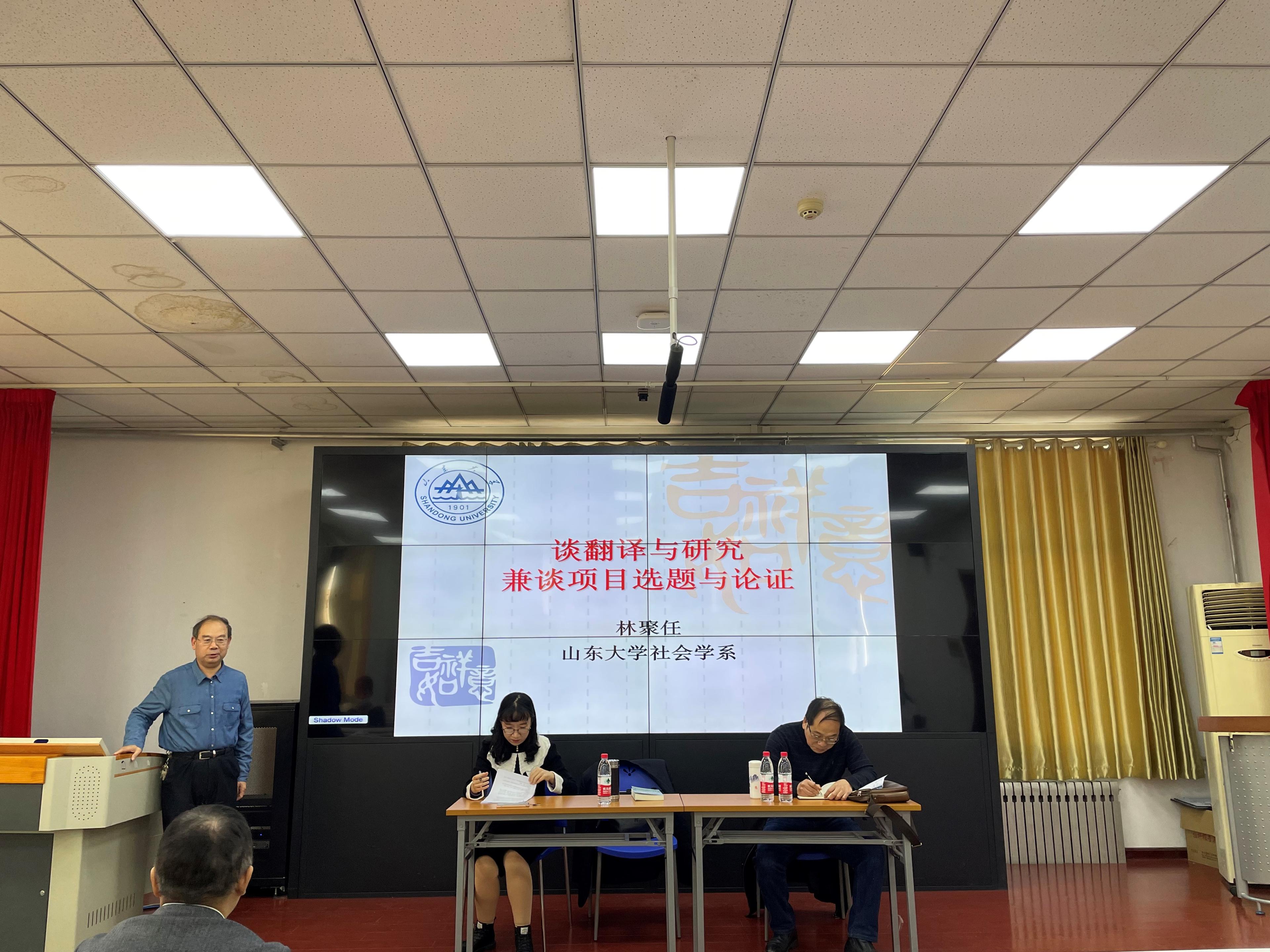 11月12日下午,外国语学院“百廿山大,九秩外院”——系列学术报告顺利举办。山东大学哲学与社会发展学院教授、博士研究生导师林聚任和外国语学院副教授包汉毅做客外国语学院“鹿鸣论坛”暨“优秀学者的养成”系列座谈会的第四讲,进行了主题为“从译者到学者:如何化被动的学术翻译为主动的学术研究”的学术报告。本次座谈会来自校内外的多名师生共同参与讨论。