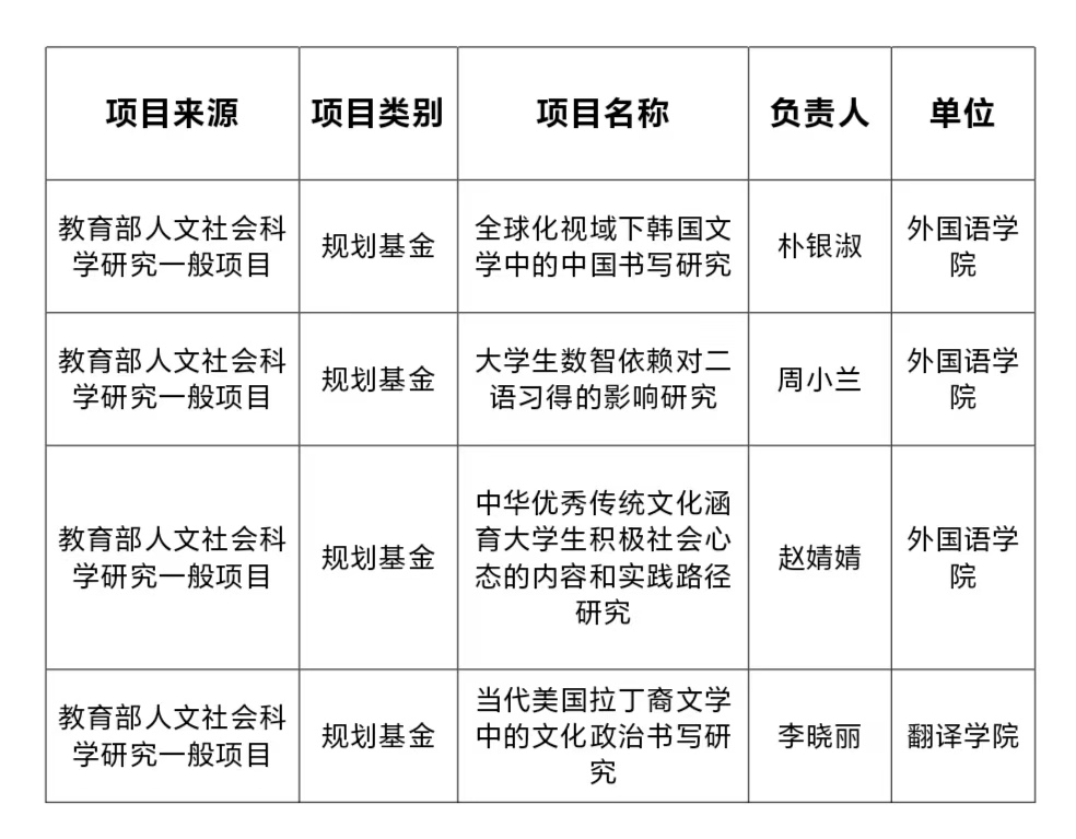 9月25日,教育部社会科学司公示了2025年度教育部人文社会科学研究一般项目的评审结果,山东大学外语学科的教师凭借扎实的学术积累与创新研究视角,在此次立项中取得显著成绩,其中外国语学院3项课题、翻译学院1项课题获批立项,涉及语言学、外国文学、教育学等多学科。立项项目信息如下: