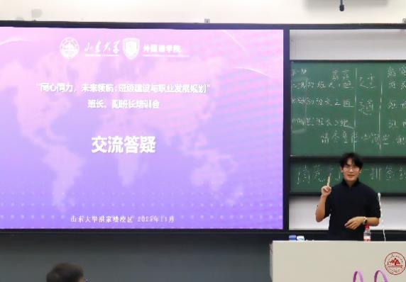 开班仪式后,分会场专题培训依次开展。在班长、副班长分会场,2025级本科生辅导员高程从班级组织建设、班委团队协作、个人成长赋能三个维度,为同学们明确职责要求、梳理工作路径。物理学院学生会执行主席冯攀强调学生骨干要从“管理者”转变为“服务者”,以实干担当践行示范引领作用;山东大学十佳班长获得者吕文豪分享了在思想引领、专业学习、班级凝聚力提升等方面的实践经验;2022级英语专业本科生薛俊鸿结合实习经历,分享了职业规划方法与求职核心技巧。