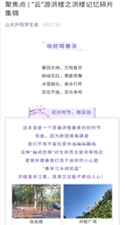 考虑到学生暂时无法返校的实际情况,外国语学院借阳春三月之际,开展“记忆中的洪楼”洪楼记忆征集活动,广泛征集外院学子手机相册中印象最深的洪楼照片和学子们笔下对洪楼最真挚的感情,通过微信推文的方式带领外院学子“云游”洪楼,领略洪楼四季之美,也能借此表达学生在疫情期间对洪楼的深切思念。