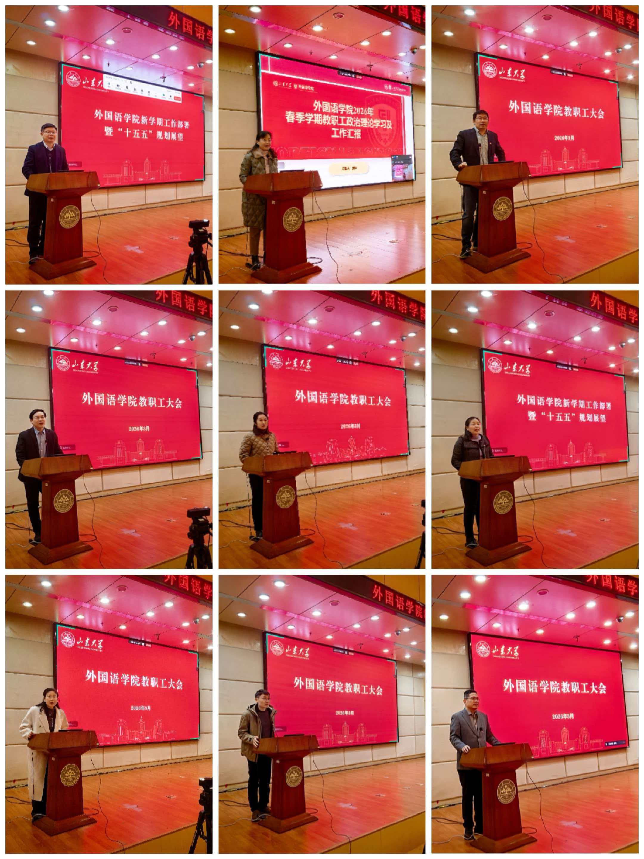 3月5日下午,外国语学院在法新楼三层报告厅召开全体教职工大会,全面部署新学期重点工作,统一思想、凝聚共识、明确任务。学院全体教职工参会,青岛校区教职工线上参会。会议由院党委副书记魏鲁鸿主持。