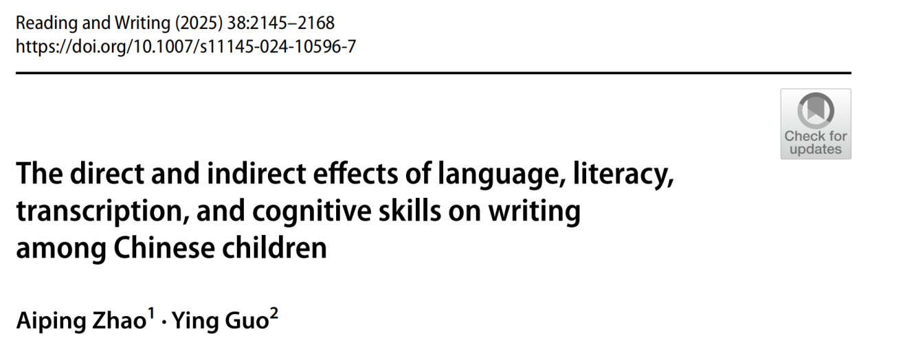该研究以汉语为母语的小学三年级学生为研究对象,基于写作直接与间接效应模型,整合基础语言技能(词汇、句法知识)、读写技能(正字法知识)、转录技能(拼写、书写流畅性)与高阶认知技能(理解监控、推理能力)四大维度,系统探究了各因素对汉语儿童写作质量的直接与间接影响路径。研究发现,儿童的推理能力、拼写与书写流畅性直接预测写作表现,句法知识通过拼写技能和推理能力间接影响写作,词汇则通过拼写技能间接影响写作。这一发现揭示了中国儿童写作能力发展的独特性——受汉字正字法和句法特征影响,转录技能、基础语言技能和高阶认知技能在该阶段的作用均很重要,为小学阶段写作教学中“语言技能训练与认知培养并重”提供了科学依据。