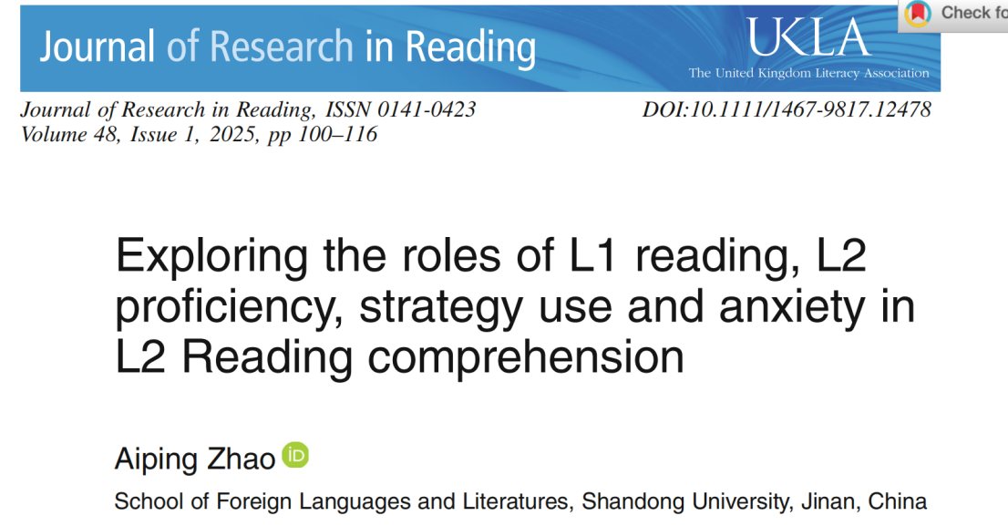 论文“Exploring the roles of L1 reading, L2 proficiency, strategy use and anxiety in L2 Reading comprehension”发表于Journal of Research in Reading(SSCI Q1,影响因子:2.0)。Journal of Research in Reading 为英国读写协会(The United Kingdom Literacy Association)主办期刊,每年仅发表20余篇论文,在国际阅读领域具较高权威。该篇论文赵爱萍副教授为第一作者,山东大学为第一作者单位。