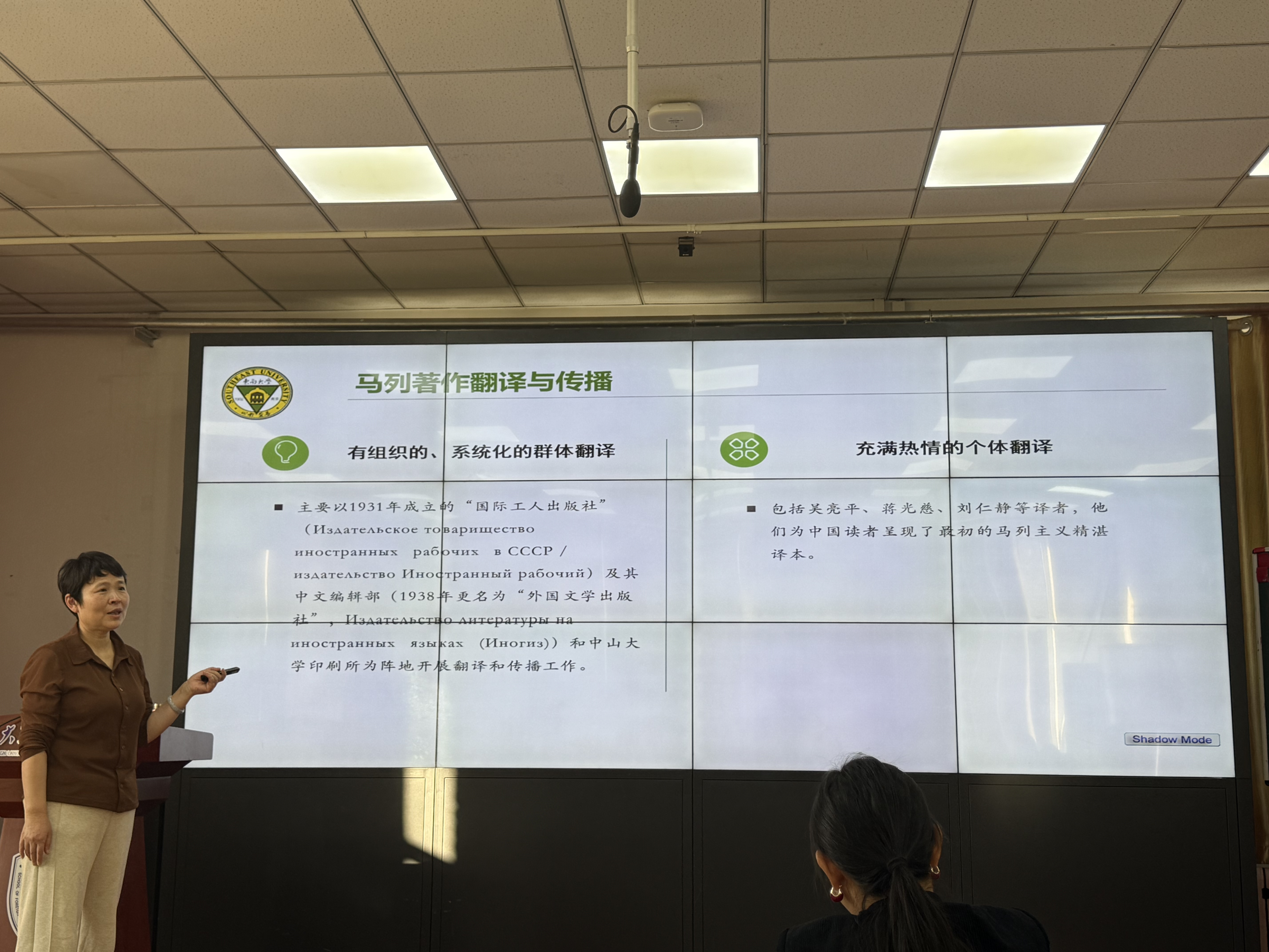 陶源通过翔实的史料数据,为在场师生勾勒出一幅波澜壮阔的历史图景。她打破了以往研究多聚焦于个别精英人物的局限,独辟蹊径地选取了63名留苏译者作为群体研究对象,结合俄罗斯社会政治史档案馆的珍贵史料,深入浅出地剖析了这一特殊群体的翻译实践活动:从瞿秋白等革命先驱在课堂上的教学翻译,到马列经典著作译介,再到对中国革命军队建设起到关键参考作用的军事文本翻译。陶源强调,中共留苏学生的翻译活动对于我党早期人才的教育培养、马列主义在中国的传播、中苏文化交流、中国的新社会科学运动乃至社会文化生活等诸多方面,都产生了深远而重要的影响。
