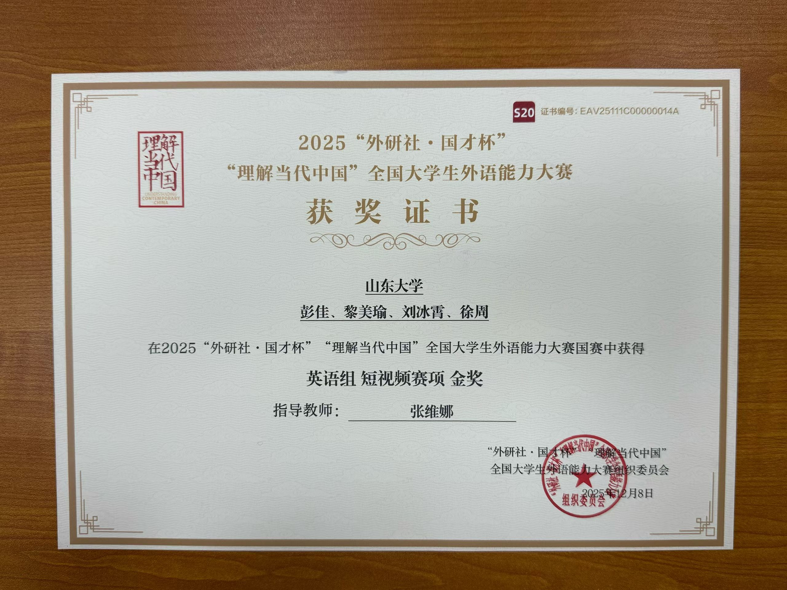 山东大学彭佳、黎美瑜、刘冰霄、徐周在2025“外研社·国才杯”“理解当代中国”全国大学生外语能力大赛国赛中获得英语组短视频赛项金奖。